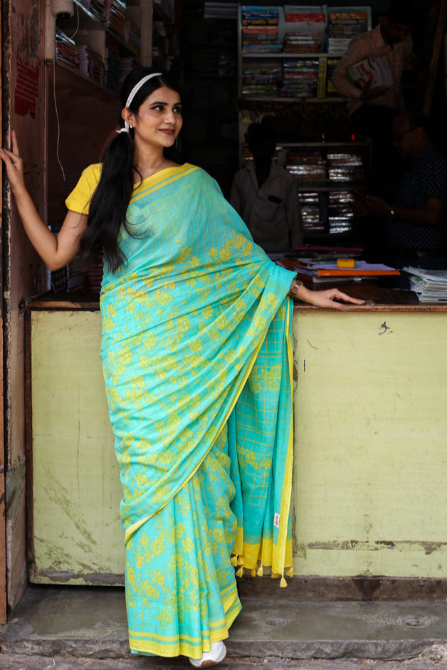 Bathed in aqua blue and kissed with sunny yellow florals, this saree carries the spirit of carefree retro summers. Light, breezy, and playful, it’s a nod to the golden days of laughter echoing through college corridors.