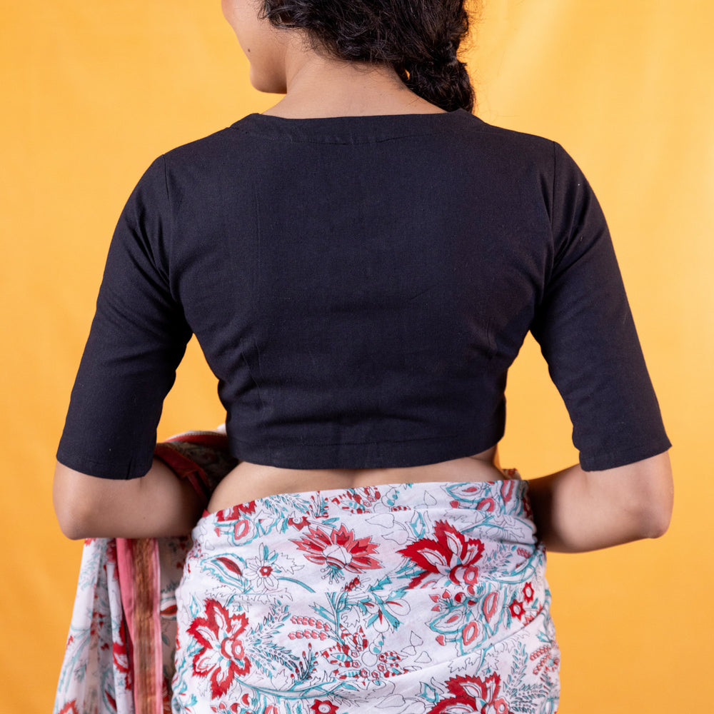 Moora's Black Cotton Elbow Sleeves Blouse is a must-have piece for your wardrobe. Crafted from breathable cotton, this ready-to-wear blouse features a flattering V-neck design, ensuring you look great from office to outings. Its versatile charm allows you to pair it effortlessly with a saree for a traditional or bold office look.