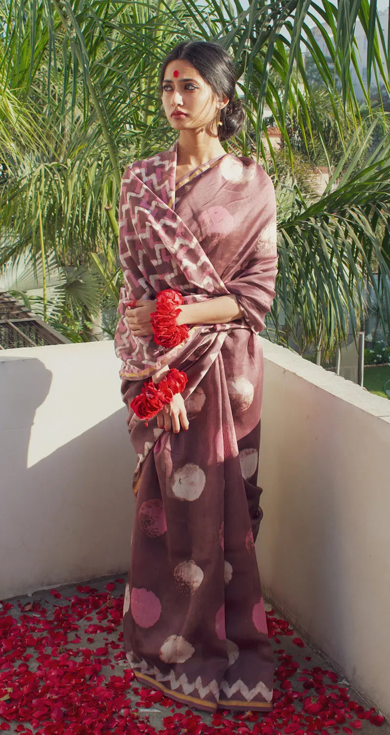 Dandelions in the Sky - Pink Hand Block Print Mulmul Cotton Bagru Saree