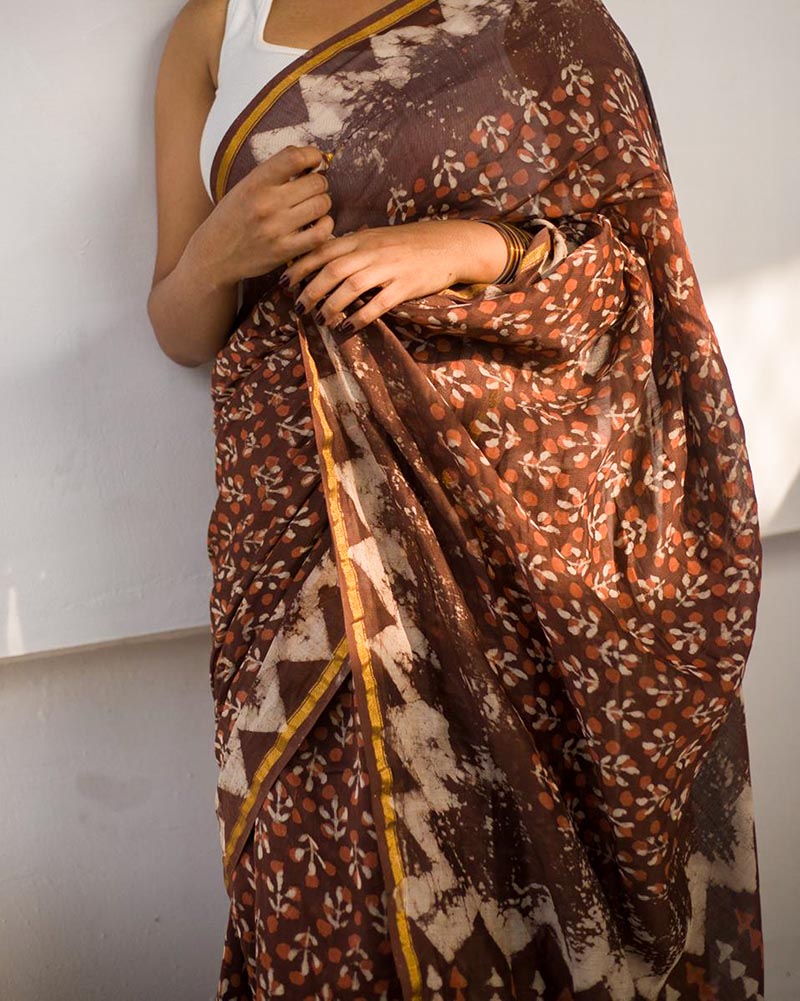 Cocoa Blossom - Hand Block Print Chanderi Silk Bagru Saree