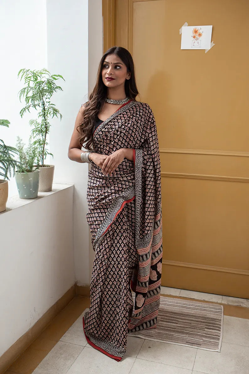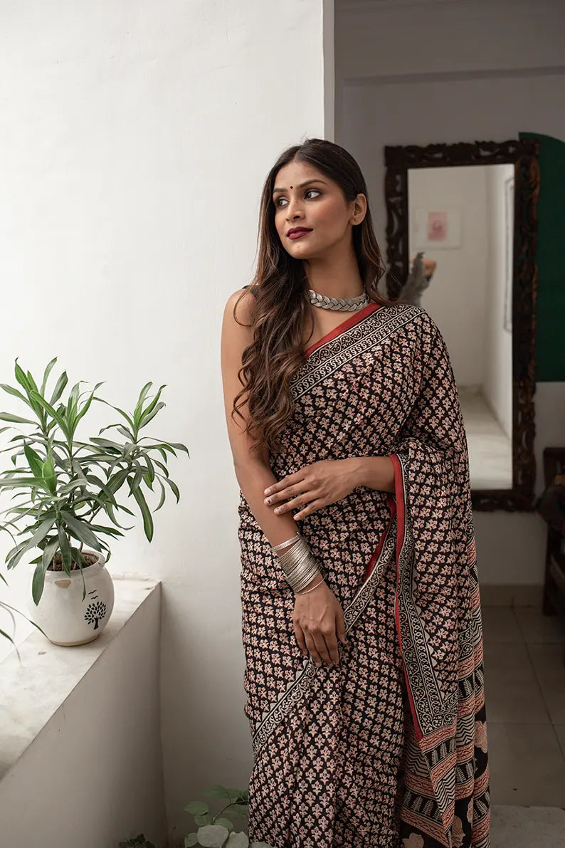 Floral Forage - Hand Block Print Mulmul Cotton Bagru Saree
