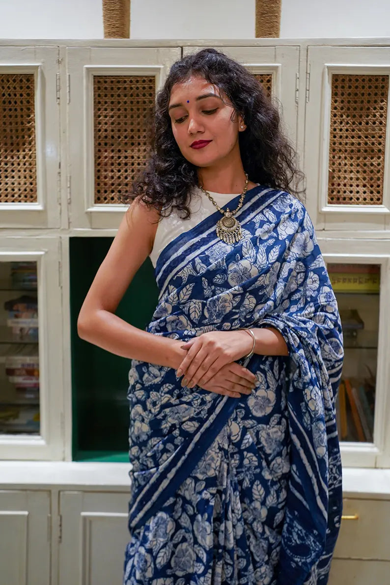 Indigo Hibiscus - Hand Block Print Mulmul Cotton Bagru Saree