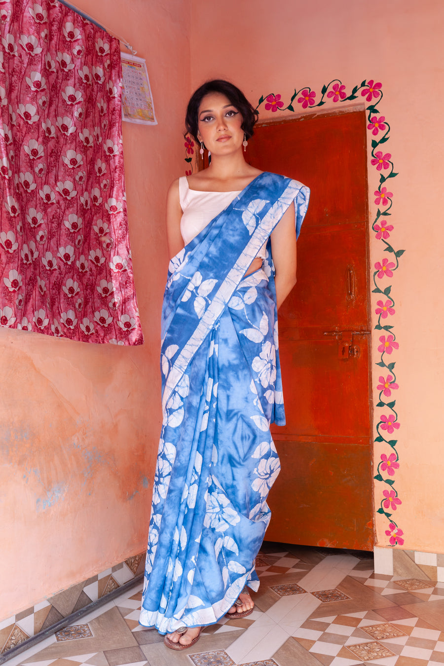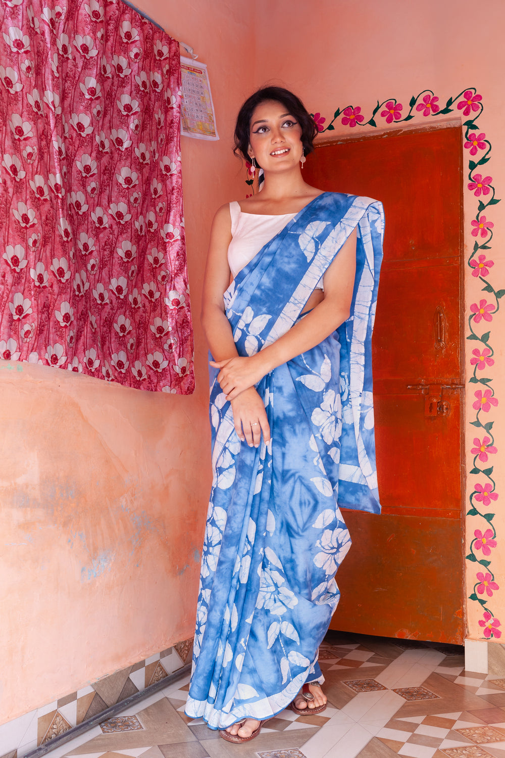Introducing ‘Khwaab’ for your dreamy romantic vibes. Hand Printed mulmul cotton saree. The beautiful blue color with floral motifs will give you a serene look, perfect for any occasion.