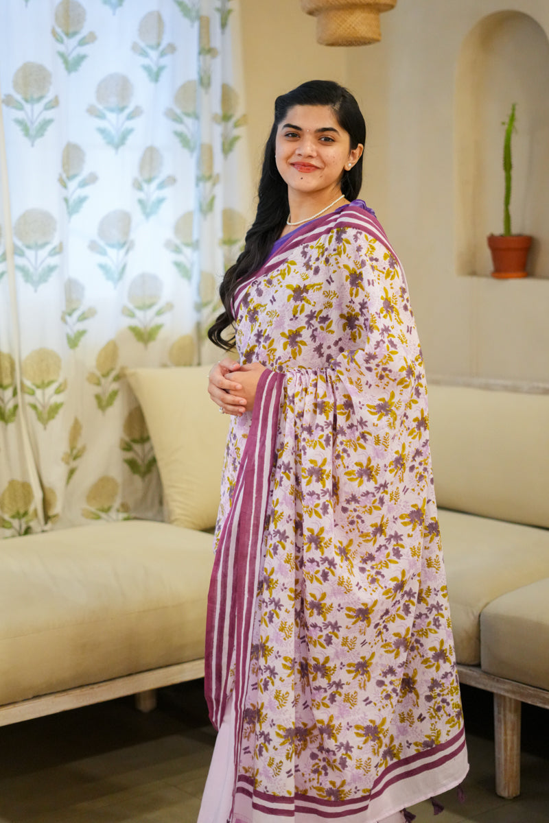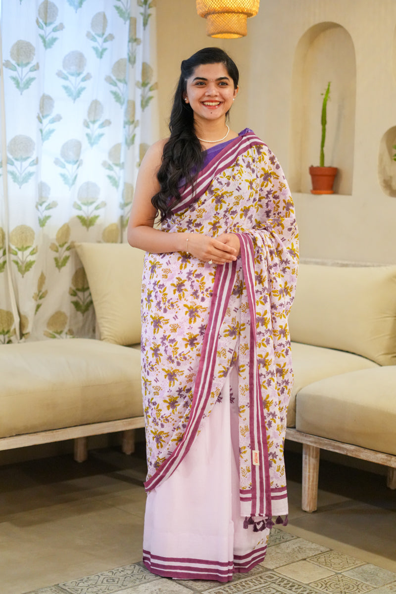 Lavender Blooms Hand Block Print Mulmul Cotton Saree