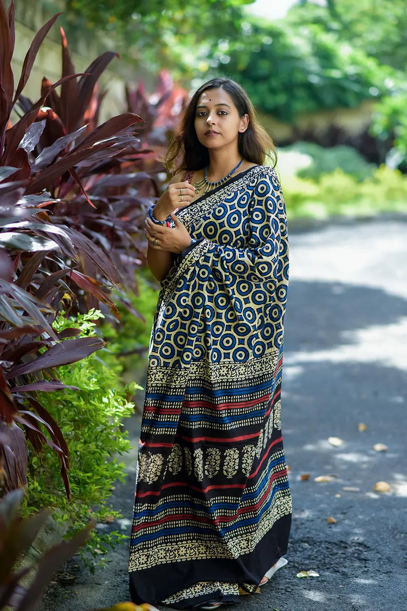 Every inch of this saree reveals exquisite hand block prints - a testament to traditional craftsmanship. The beige base serves as the canvas, and the blue circular motifs leap out like a joyous melody. The combination is stunning, creating a piece of wearable art that will surely catch eyes and capture hearts.