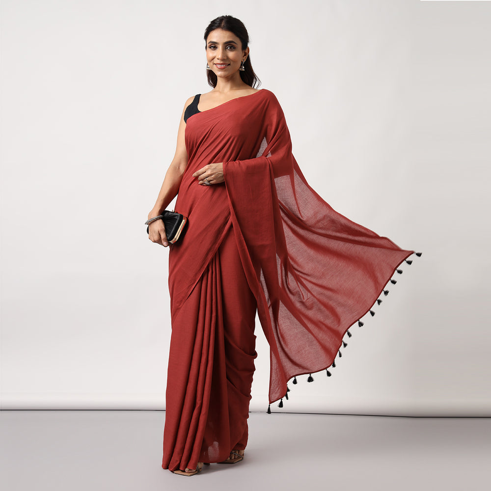 Shine on this festival season in our Midnight Rose dark red plain mulmul saree accessorised with tassels. Pair it with a belt or traditional jewellery for the perfect Diwali party look. The saree comes with a black coloured blouse piece.