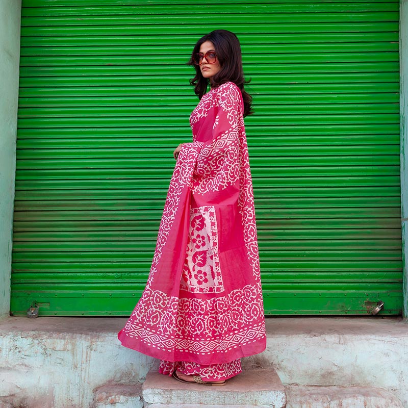 It’s time to slay in the Pink Mohini Moora saree. The amazing designs are hand block printed with vibrant color on the soft cotton saree by the artisans of Rajasthan.