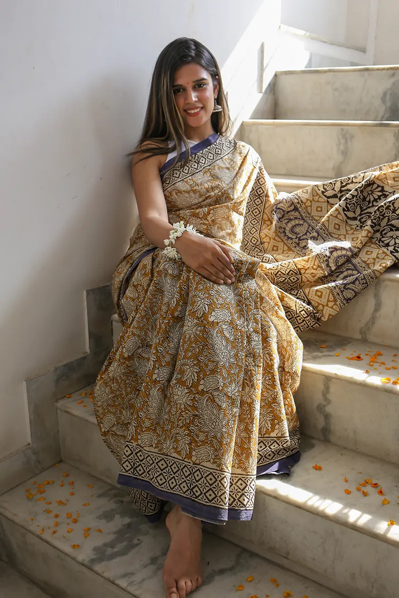 Mustard Fields - Dabu Hand Block Print Mulmul Cotton Bagru Saree