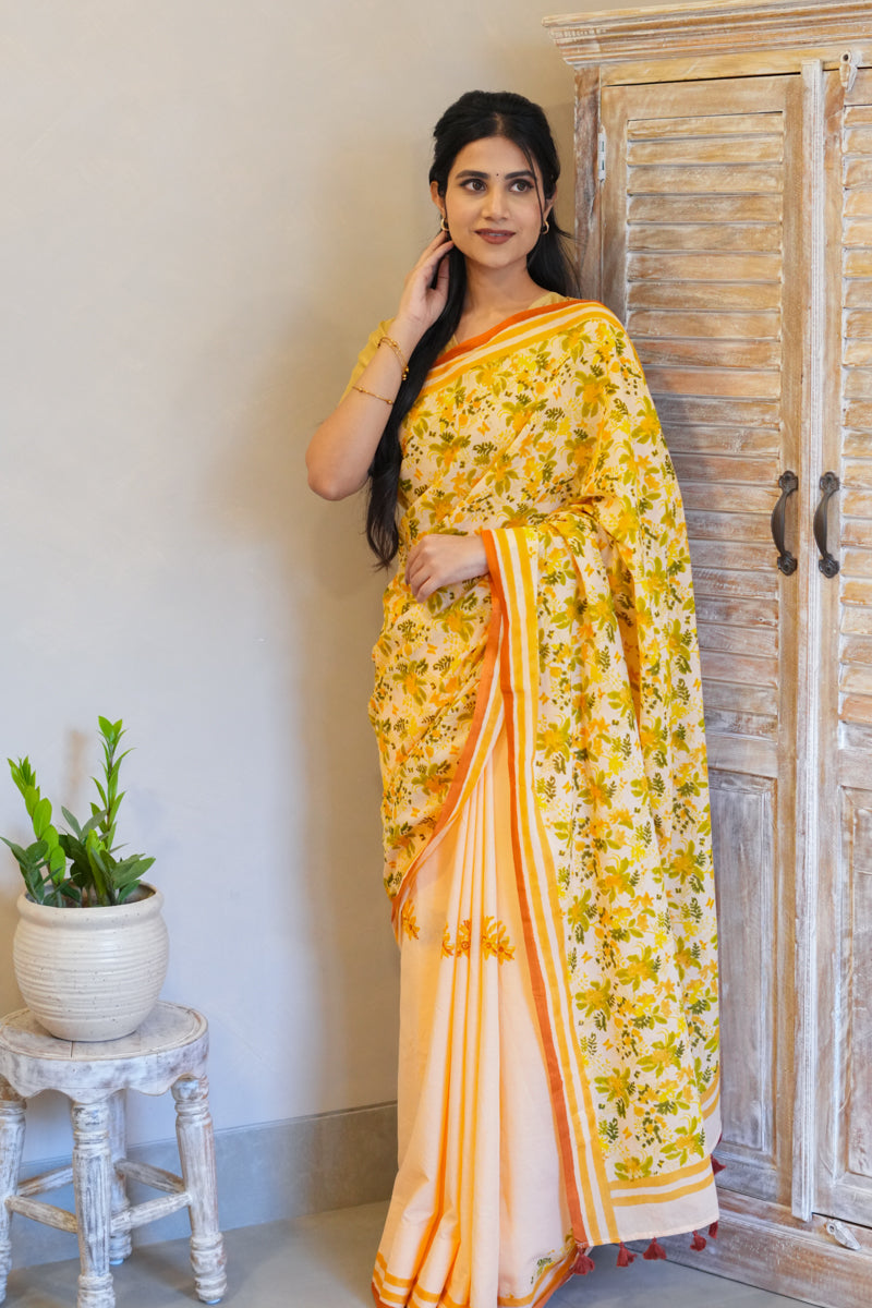 Peach Blooms hand block printed mulmul saree showcases charming yellow flowers with green leaves on the pallu, accented by subtle yellow-lined borders. Light, graceful, and full of warmth — perfect for intimate celebrations and new beginnings.
