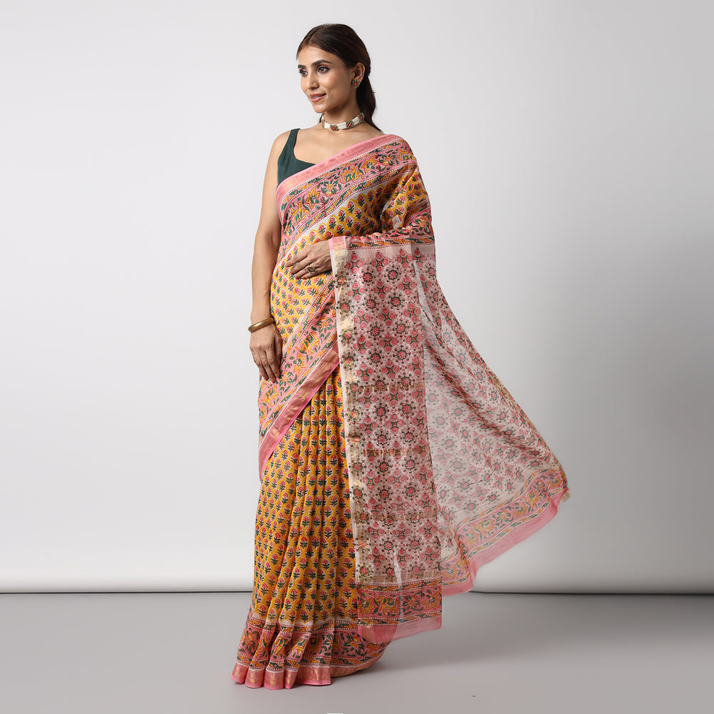 Imagine a sunlit yellow field. That's the essence of our saree. Yellow, the color of sunshine, hope, and happiness. This lively color lends the saree an irresistible charm, making it a splendid addition to your wardrobe. The hand block print is an artistic delight. A field of pink poppies, each blossom adding a dash of vibrancy to the sunny yellow base. It's more than a print; it's an enchanting journey through a poppy field, beautifully captured on a canvas of elegance.