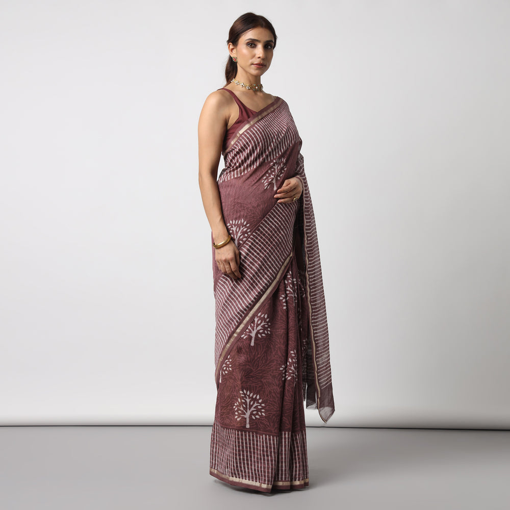 Representing the trees of life, the Revathy chanderi saree is adorned with delicate patterns featuring banyan trees and stylish lines in a unique rose-brown color. This saree will drape you perfectly for any gathering or special occasion. Delicately hand block printed on fine Chanderi silk fabric, the piece is embellished with a golden zari border.