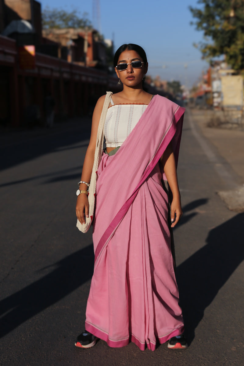 Dandelions in the Sky - Pink Hand Block Print Mulmul Cotton Bagru Saree