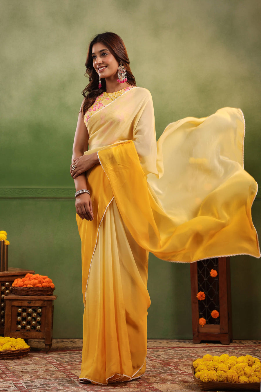 Shades of Yellow Ombre Organza Saree with Printed Blouse Fabric