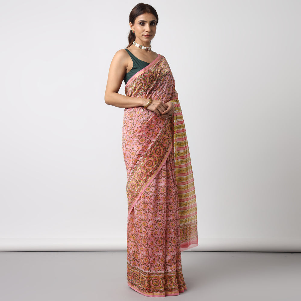 Dandelions in the Sky - Pink Hand Block Print Mulmul Cotton Bagru Saree
