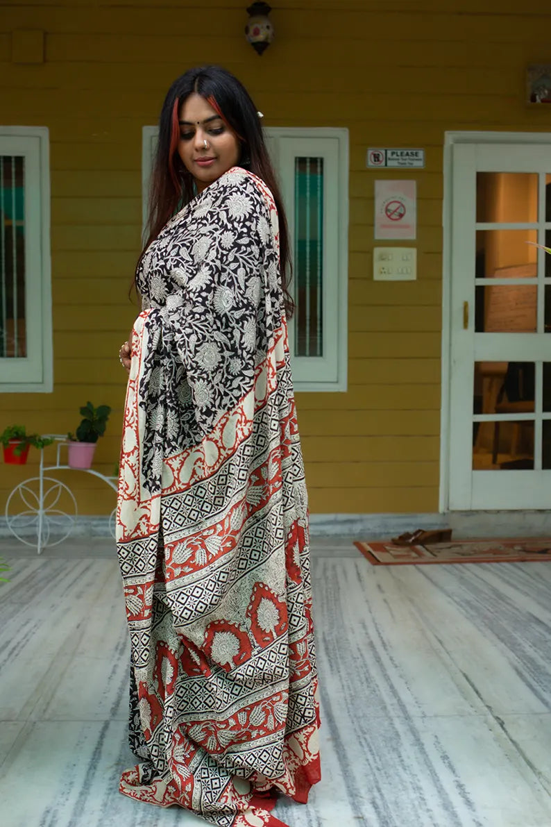 Embrace the weave of stories with Tangled Treasures hand-block printed mulmul cotton saree. The intricate floral web whispers tales of intertwined histories and cultures, a chronicle of our vibrant legacy. Crafted with the age-old Bagru technique, its hues of red, black, and beige paint the canvas of this saree, mirroring the earth's soulful palette.