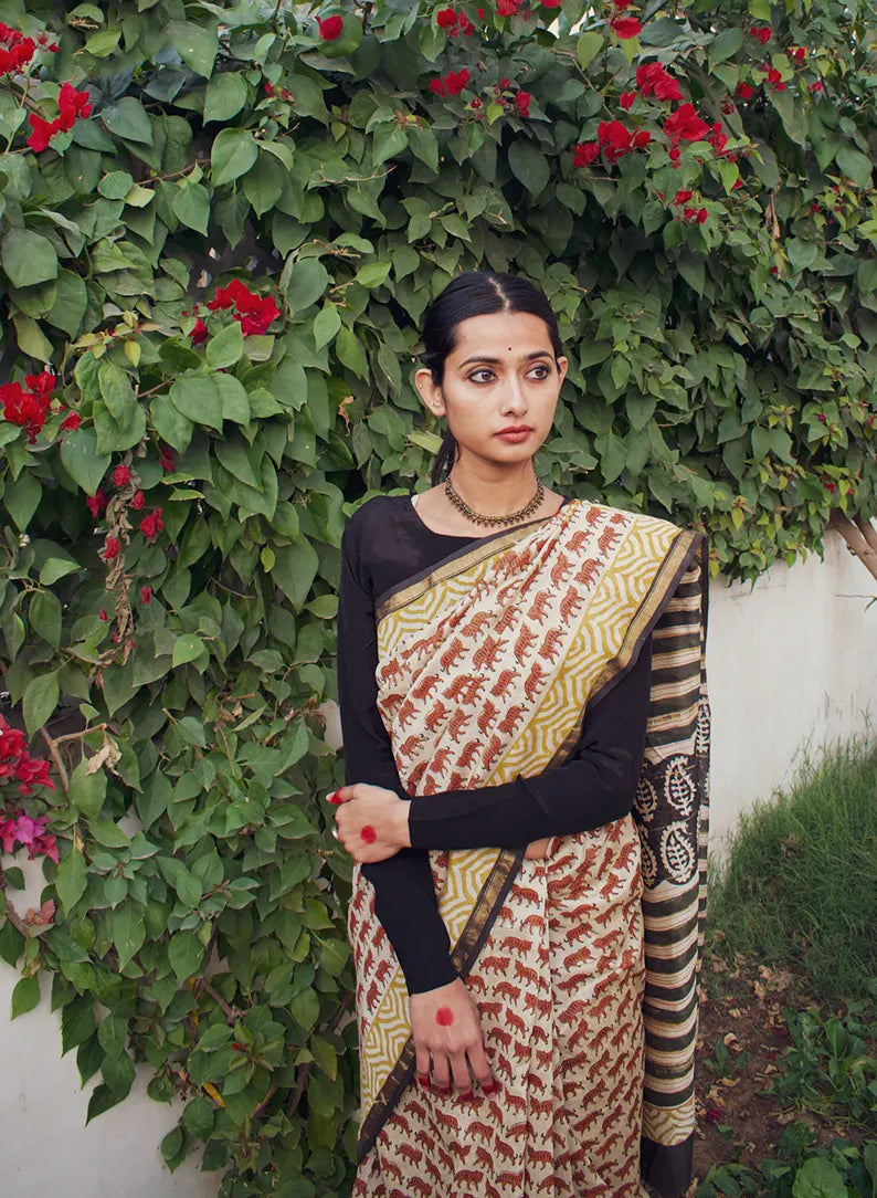 Tigress - Beige Hand Block Print Chanderi Silk Saree