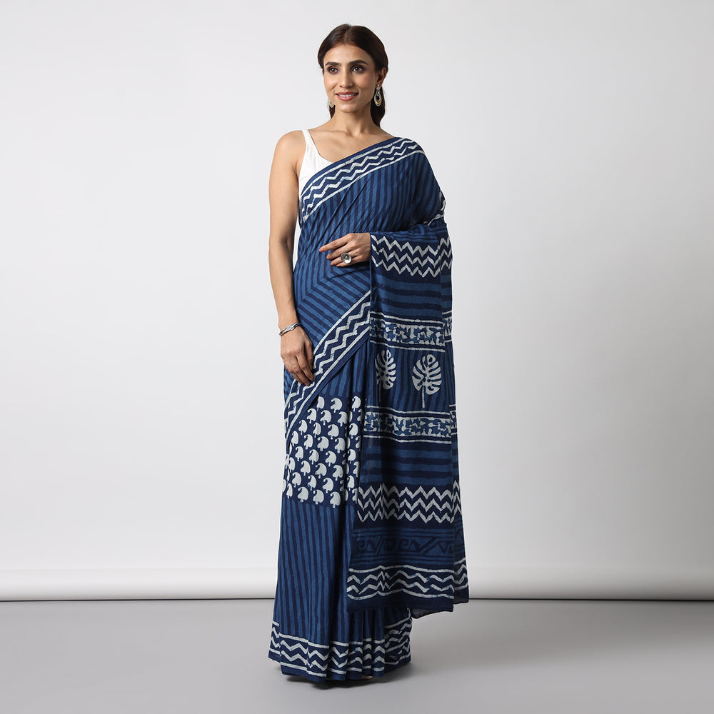 Indigo Spells - Dabu Hand Block Print Mulmul Cotton Bagru Saree