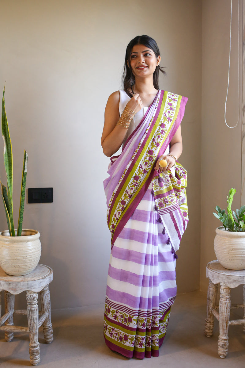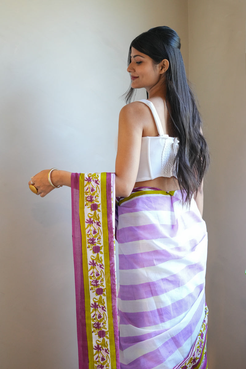 Wildflower Stripes hand block printed mulmul saree showcases a serene purple-white striped cotton pattern, exuding effortless grace. Perfect for intimate celebrations and fresh beginnings, it offers a breezy elegance that's effortlessly timeless.