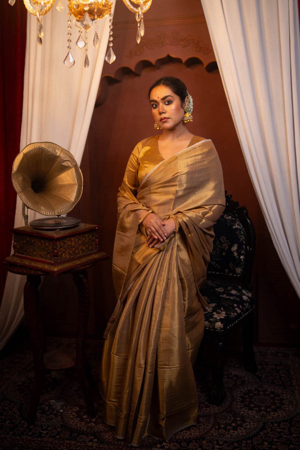 Make a statement of grace and opulence with this exquisite Abha Tissue Saree. Crafted from luxurious tissue fabric, this saree gleams with a radiant gold finish, perfect for weddings, festive celebrations, or any occasion where you want to shine. The sheer, lightweight texture of the tissue gives the saree an ethereal, almost mystical quality, while the subtle sheen catches the light with every movement.