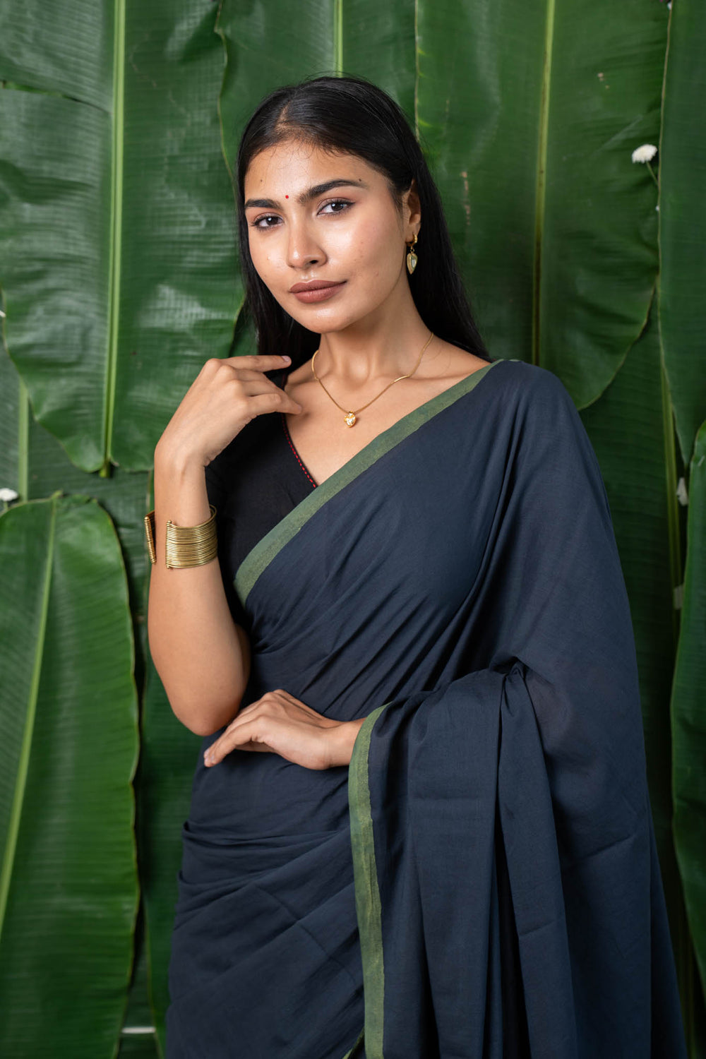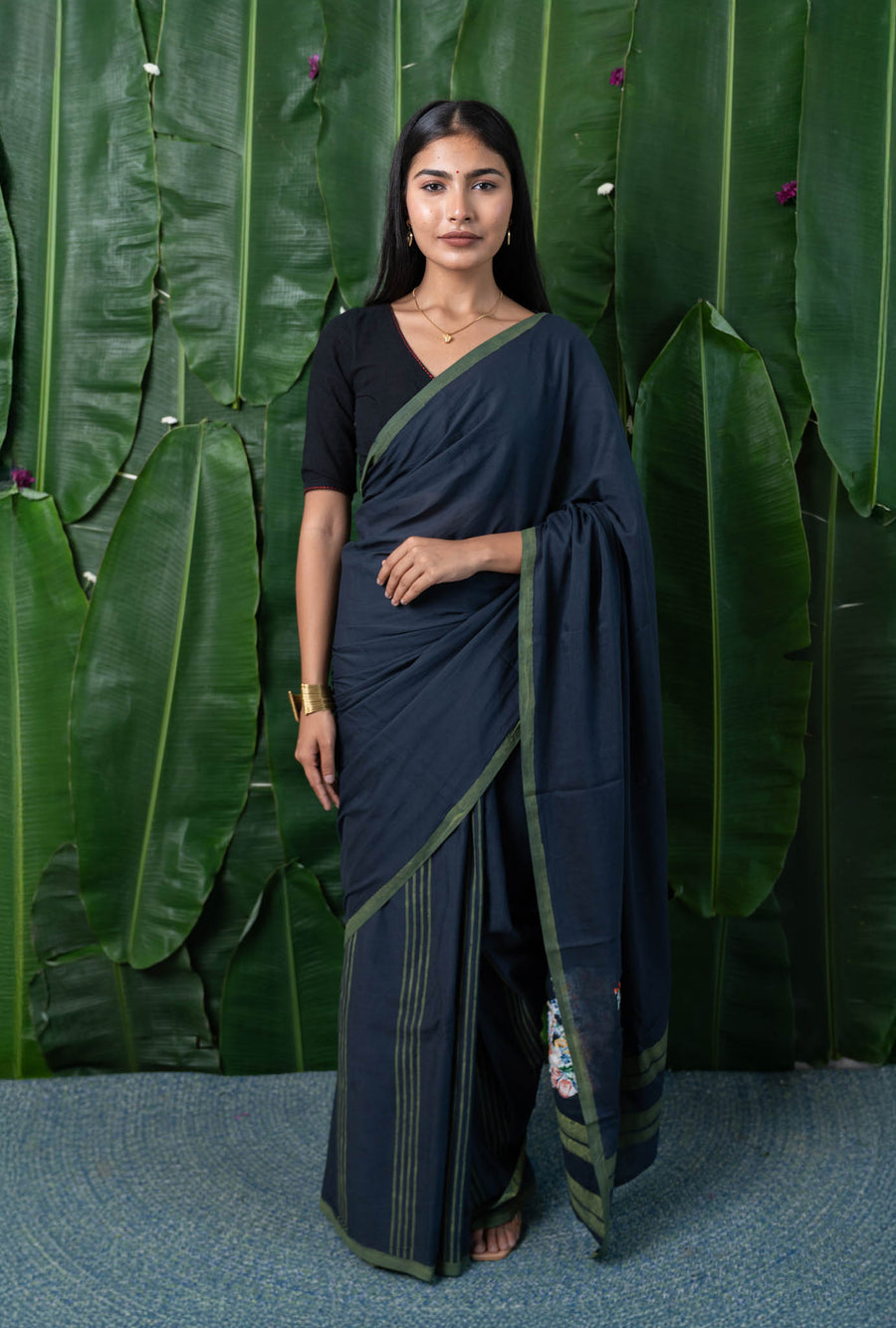 The Blossoming Grey Embroidery Mulmul Cotton Saree exudes refined elegance. In a deep, inky blue reminiscent of a moonlit night, it features vibrant floral embroidery in pink, yellow, blue, and white—like a garden in bloom. An olive-green border and striped detailing add subtle contrast. Perfect for evening gatherings or formal occasions, this handcrafted saree is a graceful statement piece with artistic charm.
