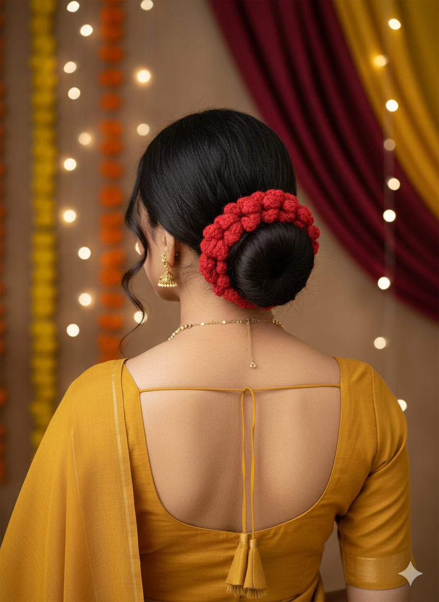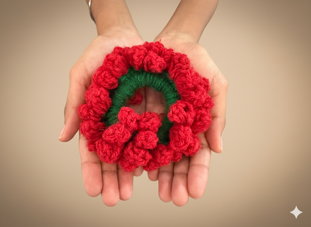 This rich red crochet gajra scrunchie is a stunning blend of comfort and craftsmanship. Carefully handmade with soft, chunky cotton yarn, it adds cozy texture and vibrant color to your everyday hair routine. The delicate floral details bring a touch of whimsy, making it perfect for elevating any style- from a casual ponytail to a romantic updo. More than just an accessory, it’s a little piece of wearable art designed to make a statement.