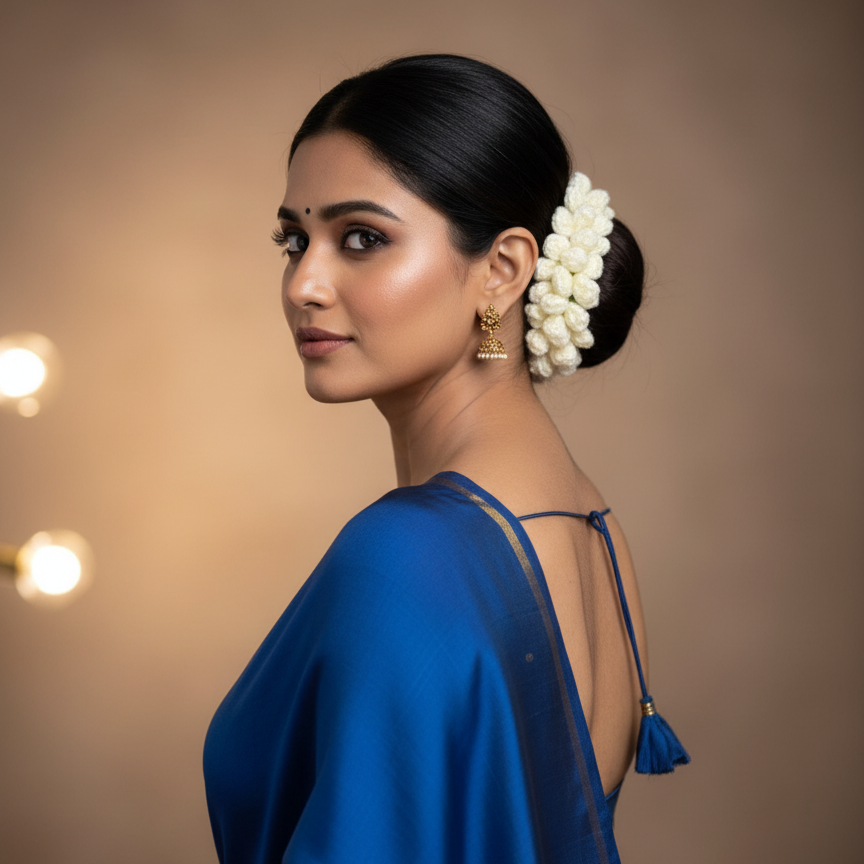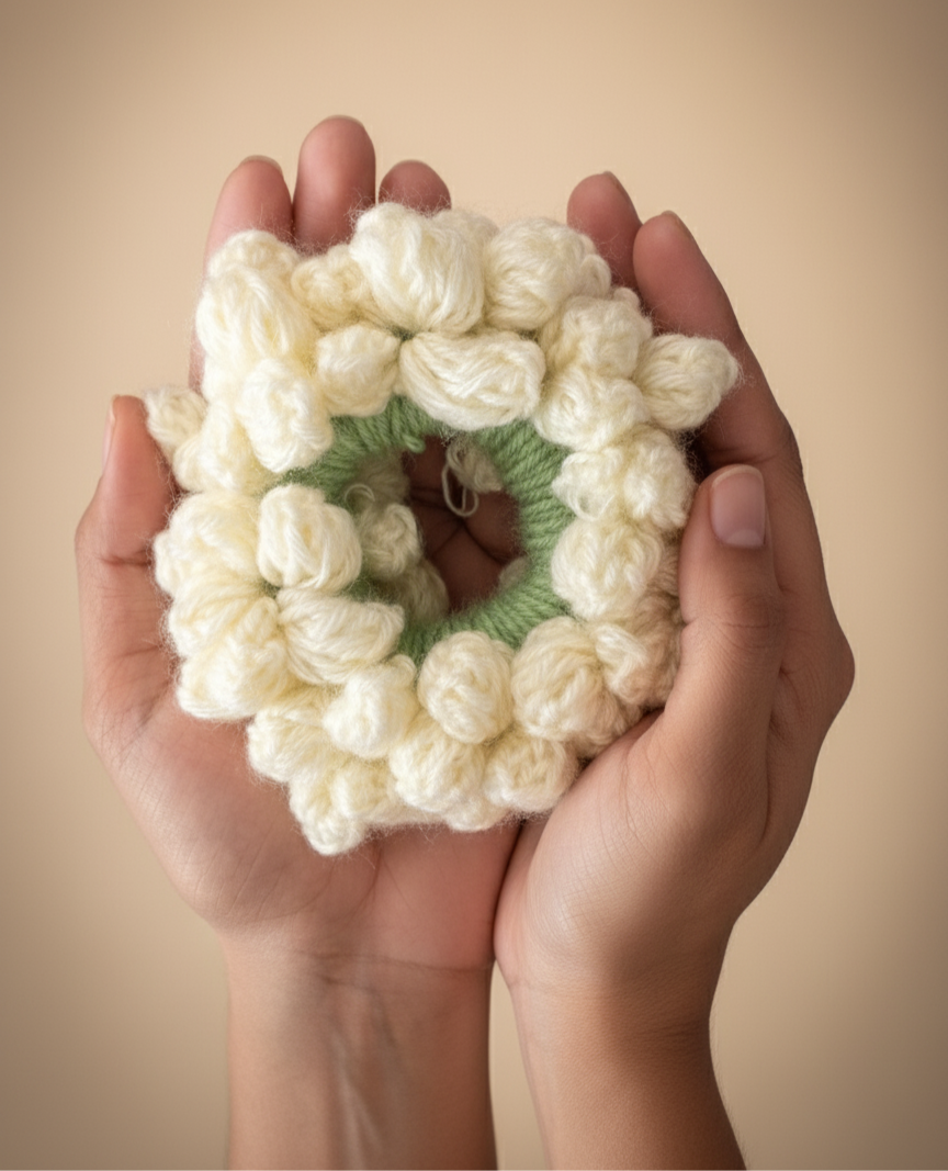 Decorate your hair in a little piece of handmade luxury. This delightful crochet gajra scrunchie is handcrafted with soft, chunky cotton yarn, creating a unique texture that feels like a cloud. The flowers add a playful, whimsical touch to any hairstyle, from a messy bun to a high ponytail. It’s not just a hair accessory- it's a wearable work of art, lovingly handmade to add comfort and charm to your everyday look.