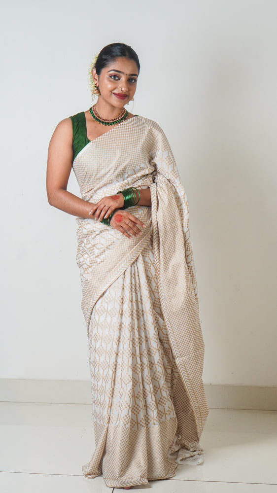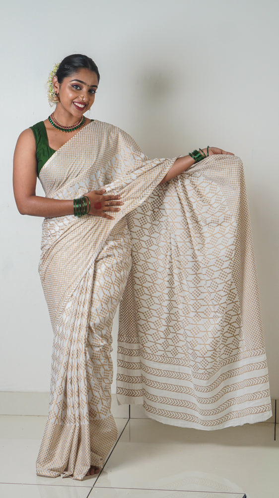 Kavya White Gold Mulmul Cotton Hand Block Print Saree
