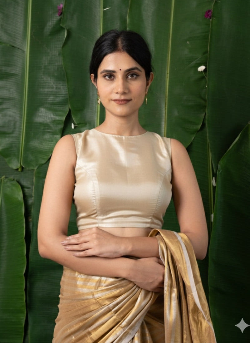 Navya is your statement party blouse, with its bold sleeveless cut and tissue sparkle. The open-back design makes it chic while still being versatile with golden or contrasting sarees. A piece that truly lets you own the night.