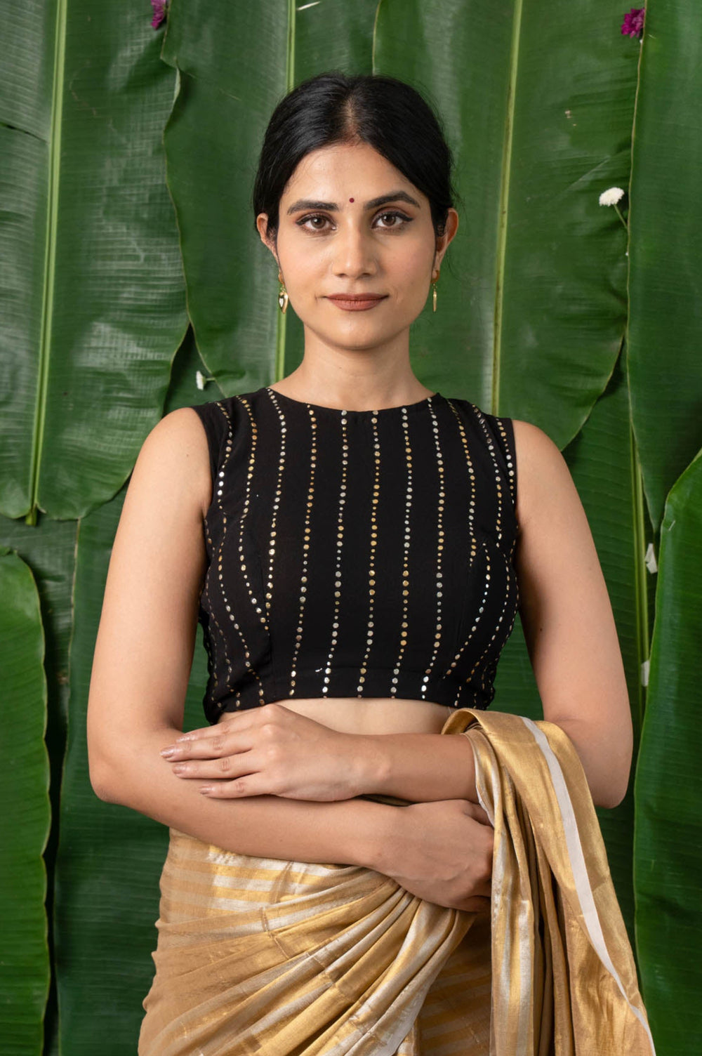 Raina is your statement party blouse, with its bold sleeveless cut and sequins sparkle. The open-back design makes it chic while still being versatile with golden or black sarees. A piece that truly lets you own the night.