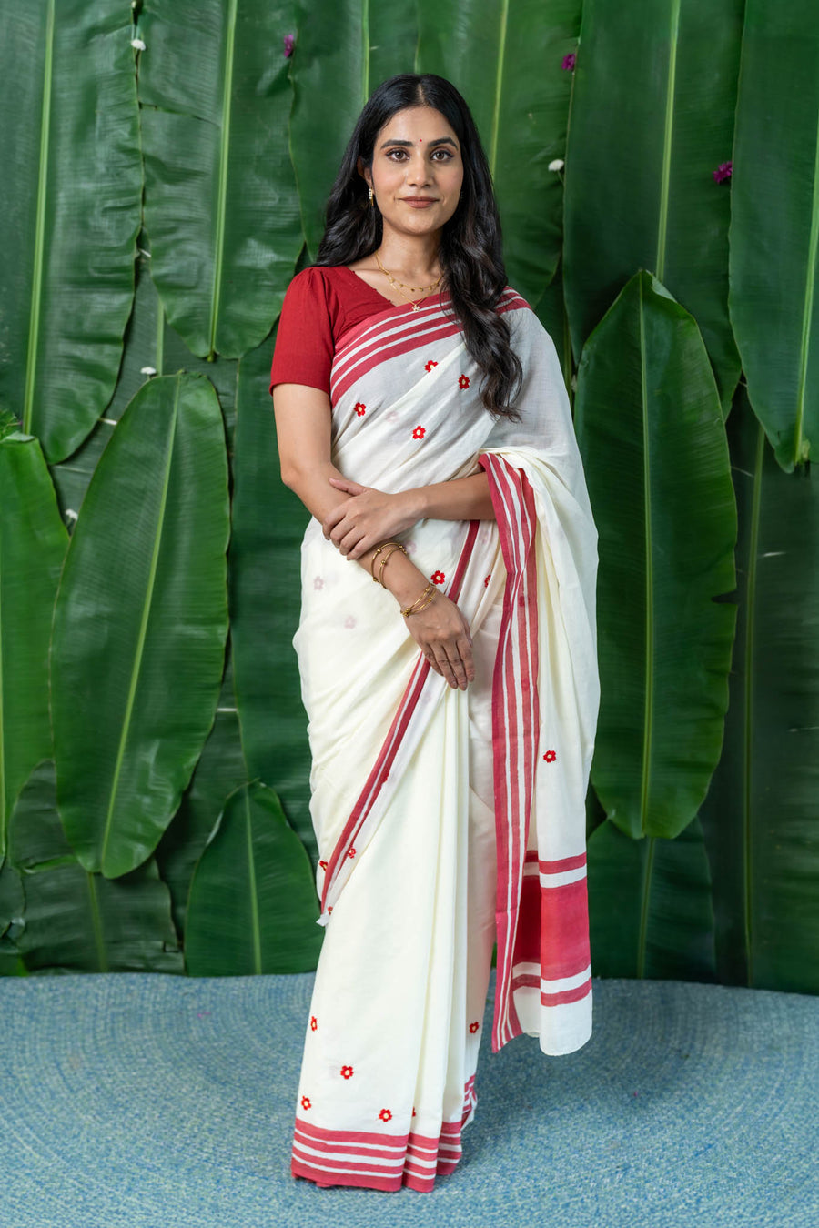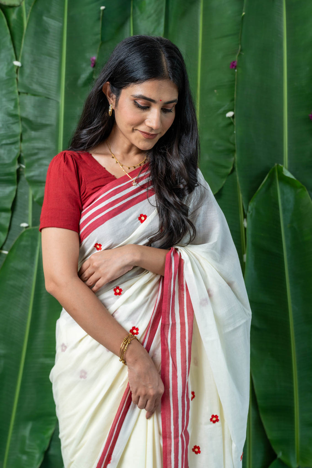 Embrace timeless grace with the White Blossom Embroidery Mulmul Cotton Saree. Its off-white base is adorned with delicate crimson floral embroidery, creating a subtle yet striking contrast. A bold, striped red border and pallu add a touch of tradition and depth. Lightweight and elegant, it's perfect for temple visits, festive occasions, or cultural gatherings.