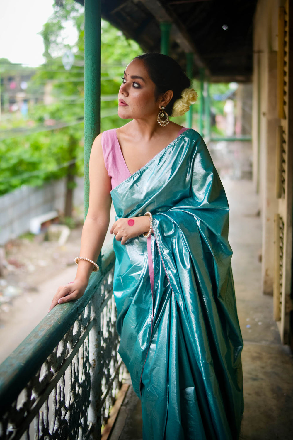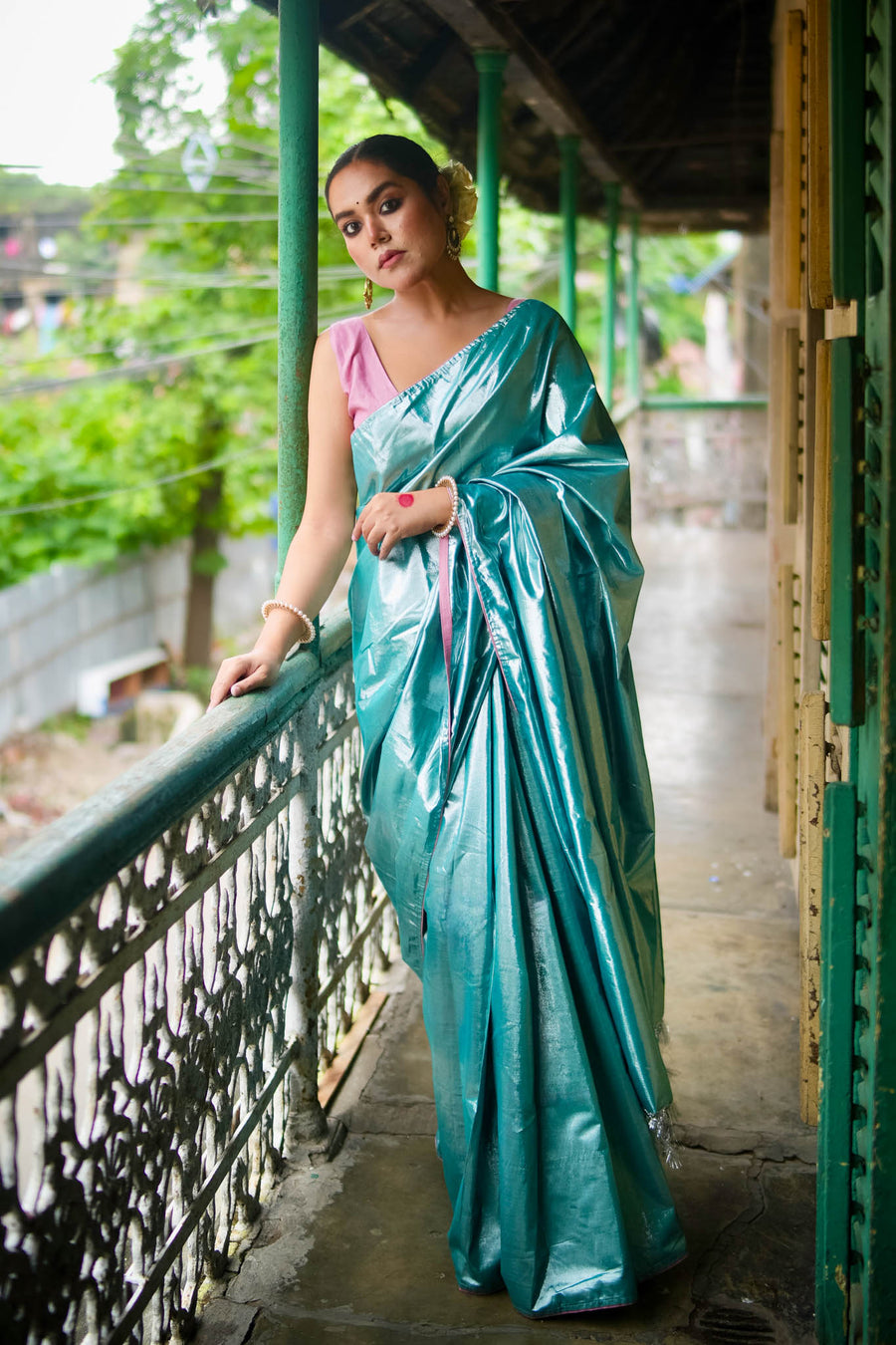 This soft blue tissue saree with delicate pink piping comes with a coordinated blouse. Ujwala carries a gentle glow, perfect for Diwali evenings when you want to shine without going over the top.