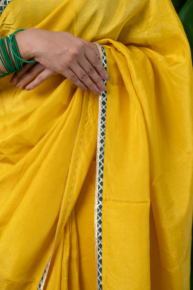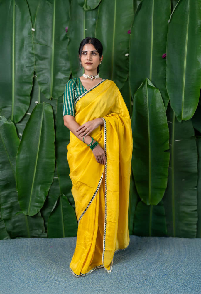 The Urja - Yellow Tissue Saree is a handcrafted cotton tissue drape in a radiant sunflower-yellow with a natural golden shimmer. Its solid body is edged with a delicate silver border and sleek green trim, blending festive charm with modern elegance. Light, airy, and graceful, it’s perfect for daytime functions and celebratory occasions.