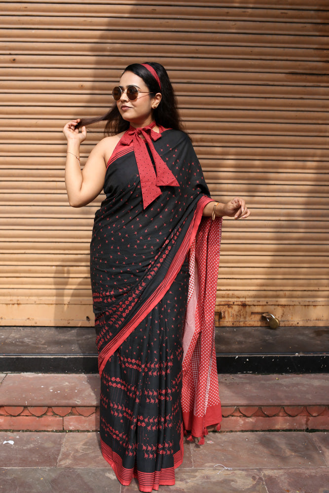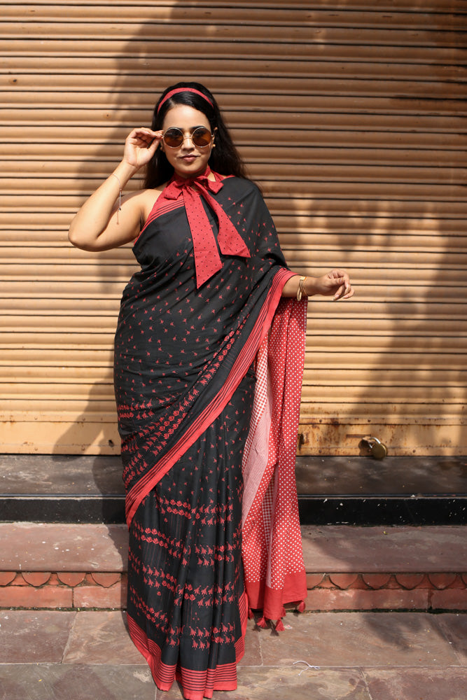 Disco Diva Printed Mulmul Cotton Saree in deep black, sprinkled with bold red motifs and finished with a striking contrast pallu. Fierce, elegant, and full of character – it’s the perfect pick for power dressing at work, festive evenings, or those days when you want your saree to speak your confidence out loud.