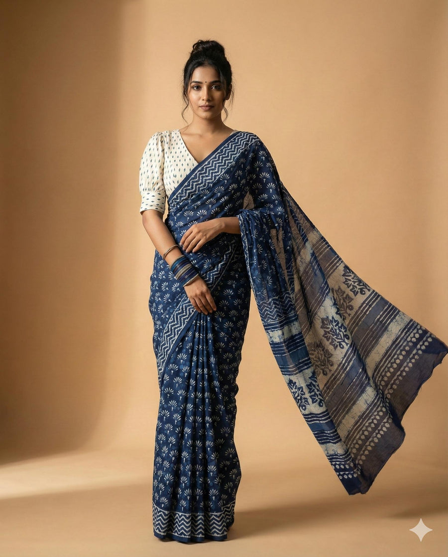 Introducing Indigo by Moora, a stunning collection of Indigo Sarees hand block printed using natural indigo dye. Crafted by the skilled artisans of Bagru, each saree undergoes an age-old traditional dyeing process that infuses the fabric with deep, rich indigo hues. These sarees not only showcase timeless craftsmanship but also bring a touch of heritage and elegance to any occasion. Discover the artistry and beauty of hand block print Indigo Sarees with Moora today.