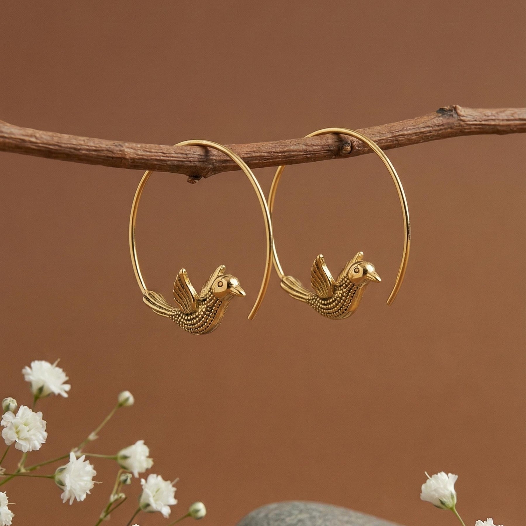 These handcrafted brass hoop earrings feature a delicate bird motif, bringing a quiet charm to everyday styling. Made from anti-tarnish brass with a gold-plated finish, they offer the look of fine jewelry with the ease of demi-fine jewelry. Lightweight and comfortable, they blend traditional detailing with a modern silhouette. Perfect for daily office wear or casual occasions, this thoughtfully crafted jewelry adds an artisanal touch without feeling heavy or overdone.