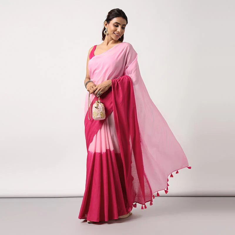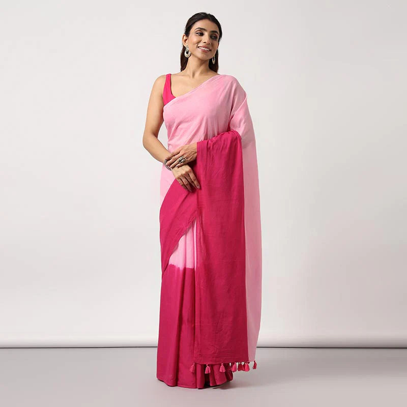 The Pink Ombre hand-dyed mulmul cotton saree paints a dreamy picture as it transitions from a delicate pink to a bright, rose pink. Crafted from superfine mul cotton, the saree's luxurious, airy softness will gently embrace your skin, providing the utmost comfort in any weather.