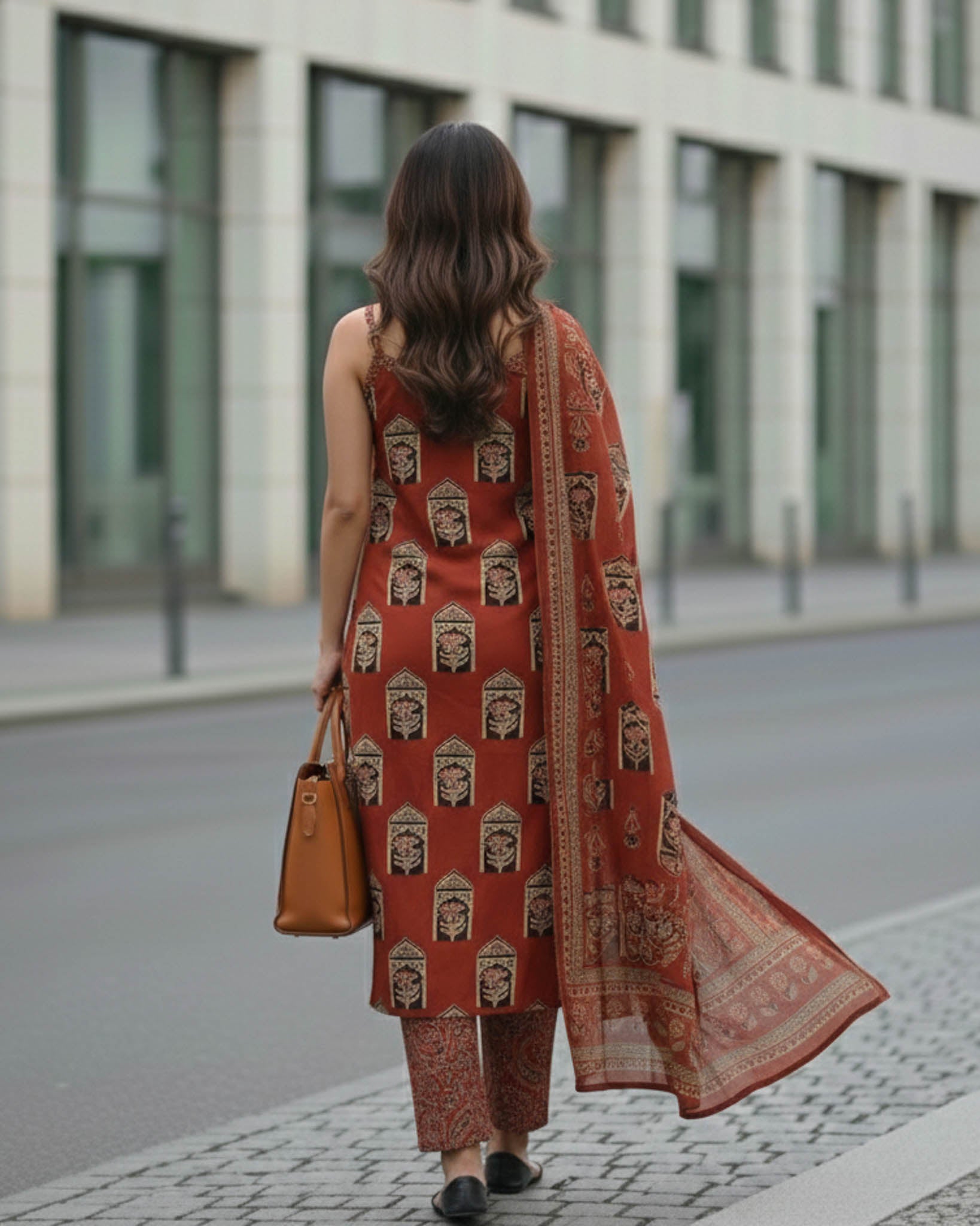 Introducing the "Leela" Printed Kurta Set with Pants, a perfect fusion of tradition and contemporary flair. The rich terracotta fabric is adorned with intricate, bold motifs that reflect timeless artistry while keeping the look fresh and versatile. Designed in a flattering, relaxed silhouette with a stylish plunge neckline, this kurta brings effortless elegance to your everyday wardrobe.