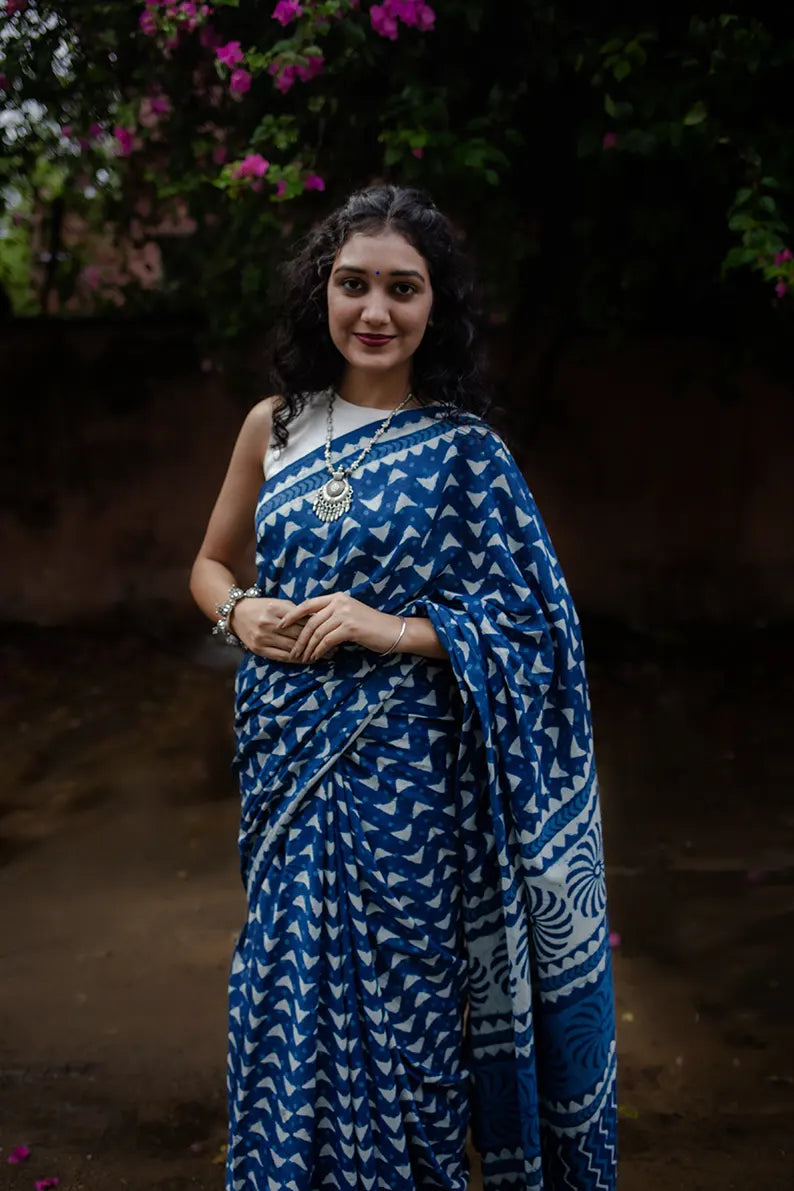 Blue Flake - Hand Block Print Mulmul Cotton Bagru Saree