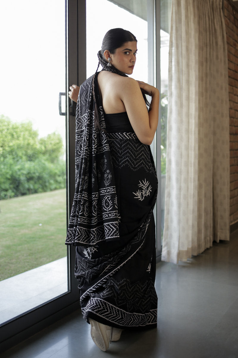 Bold Black Hand Block Print Mulmul Cotton Saree in classic black, adorned with intricate zigzag and dotted motifs in ivory. Fierce yet refined, this monochrome beauty is perfect for long workdays, gallery evenings, or when you're in the mood to wear your strength in soft fabric.