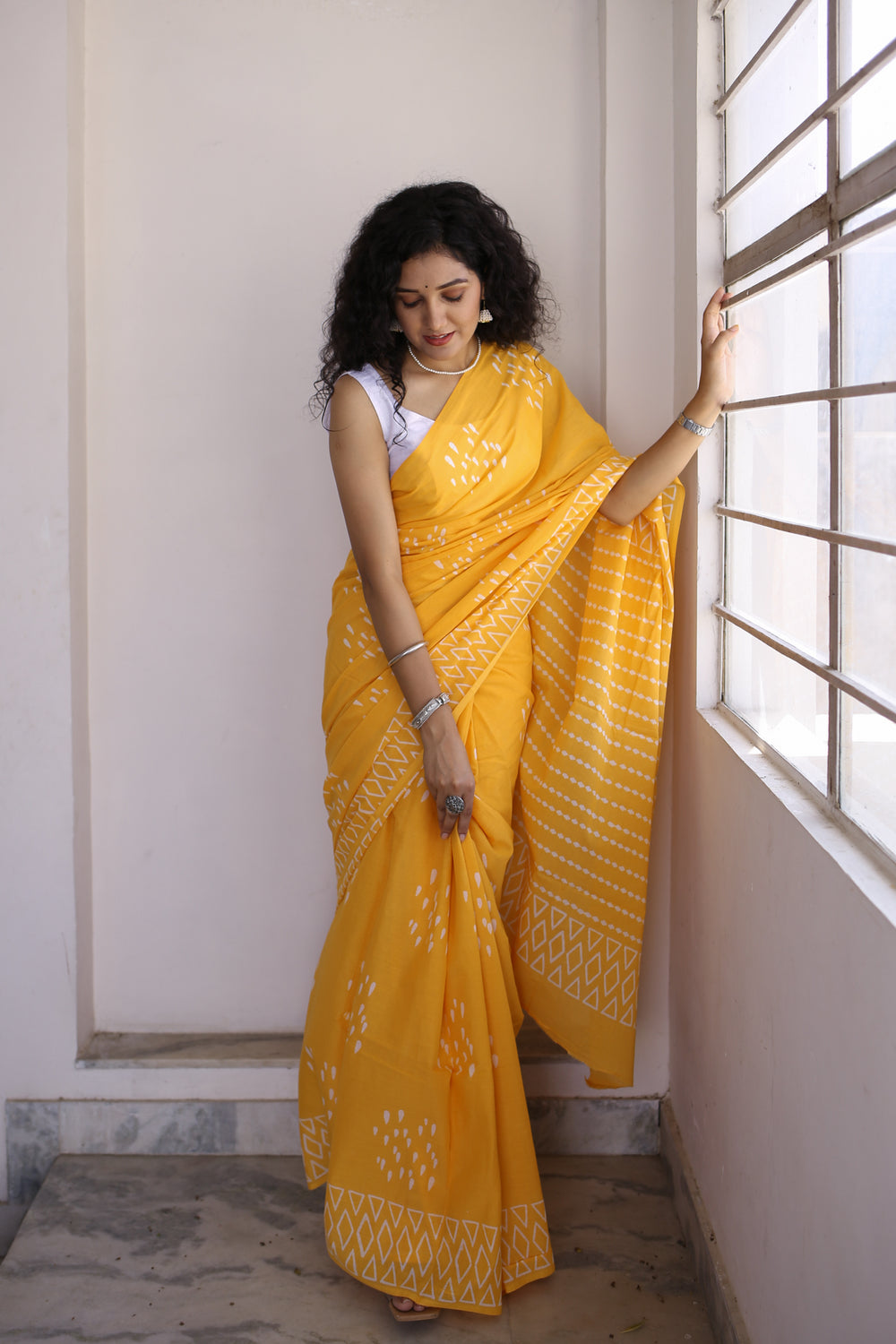 Drizzle in Backyard - Yellow Hand Block Print Mulmul Cotton Bagru Saree
