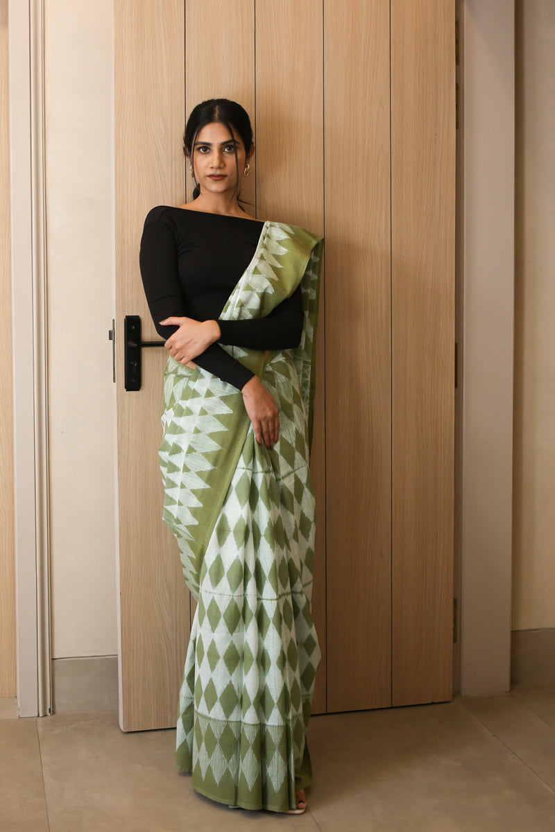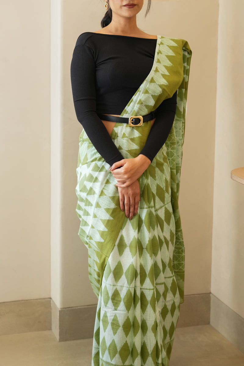 Mist Over Meadows batik mulmul cotton saree features elegant green rhombus lines woven across a soft, breezy canvas. Subtle yet striking, it's perfect for intimate celebrations and serene new beginnings.