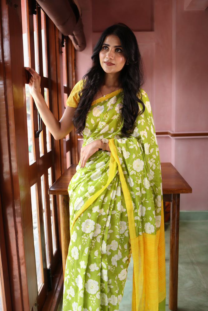 Misty Memories Mulmul Cotton Saree in a refreshing lime-green base, scattered with bold white floral prints and finished with a sunshine-yellow border. Fresh, radiant, and full of life – it’s the perfect pick for summer days, casual celebrations, or when you want your saree to bring a burst of cheer wherever you go.