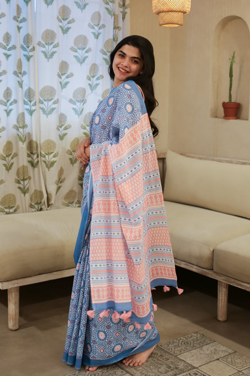 Dandelions in the Sky - Pink Hand Block Print Mulmul Cotton Bagru Saree