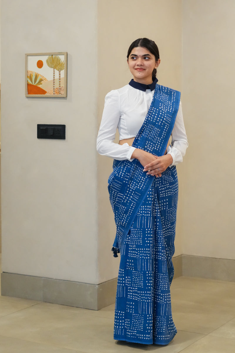 Indigo Spells - Dabu Hand Block Print Mulmul Cotton Bagru Saree