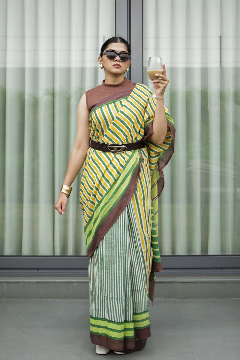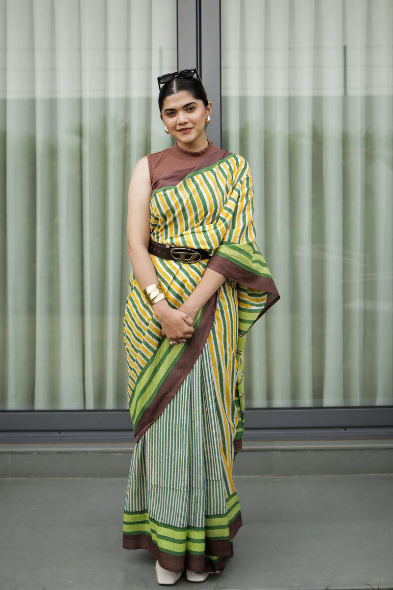 Retro Rani Hand Block Print Mulmul Cotton Saree in yellow, forest green, lime, and cocoa - a grounded palette of earthy stripes with a touch of sunshine. Playful yet balanced, it's ideal for workdays with personality, slow Sundays, and everything in between.