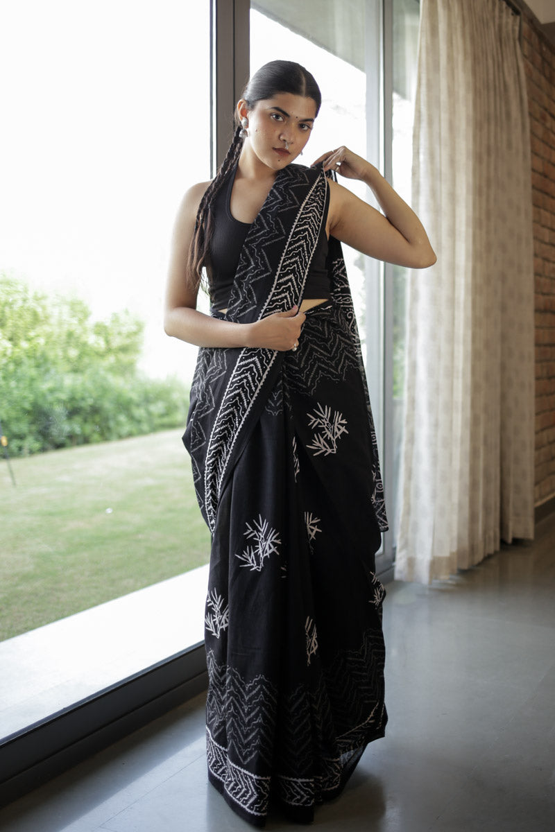 Bold Black Hand Block Print Mulmul Cotton Saree in classic black, adorned with intricate zigzag and dotted motifs in ivory. Fierce yet refined, this monochrome beauty is perfect for long workdays, gallery evenings, or when you're in the mood to wear your strength in soft fabric.