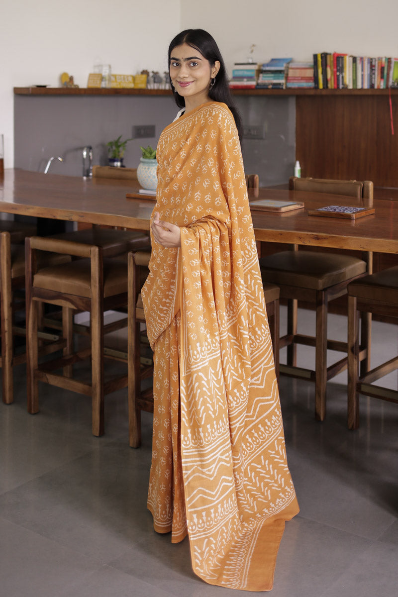 Dusty Orange Hand Block Print Mulmul Cotton Saree