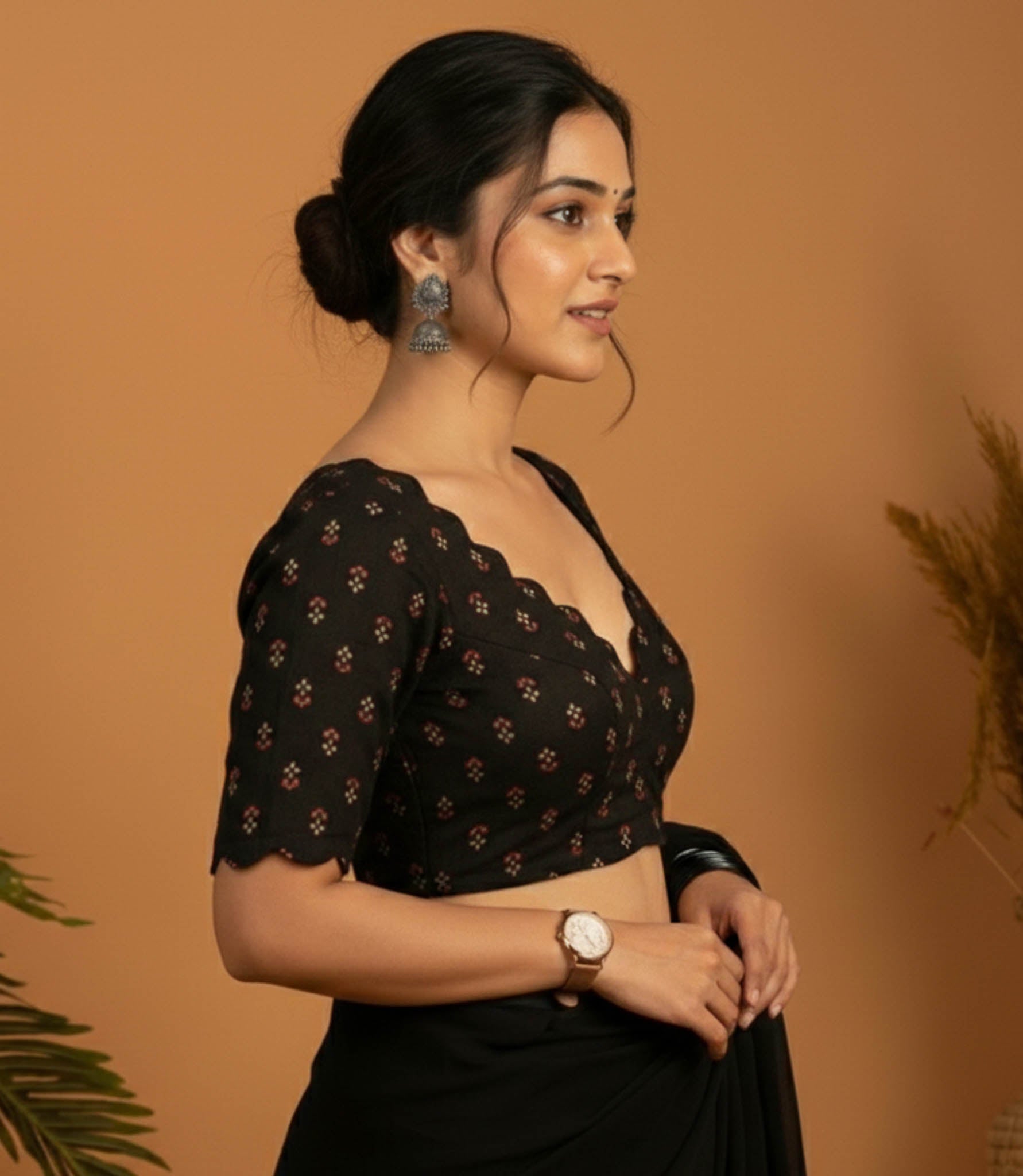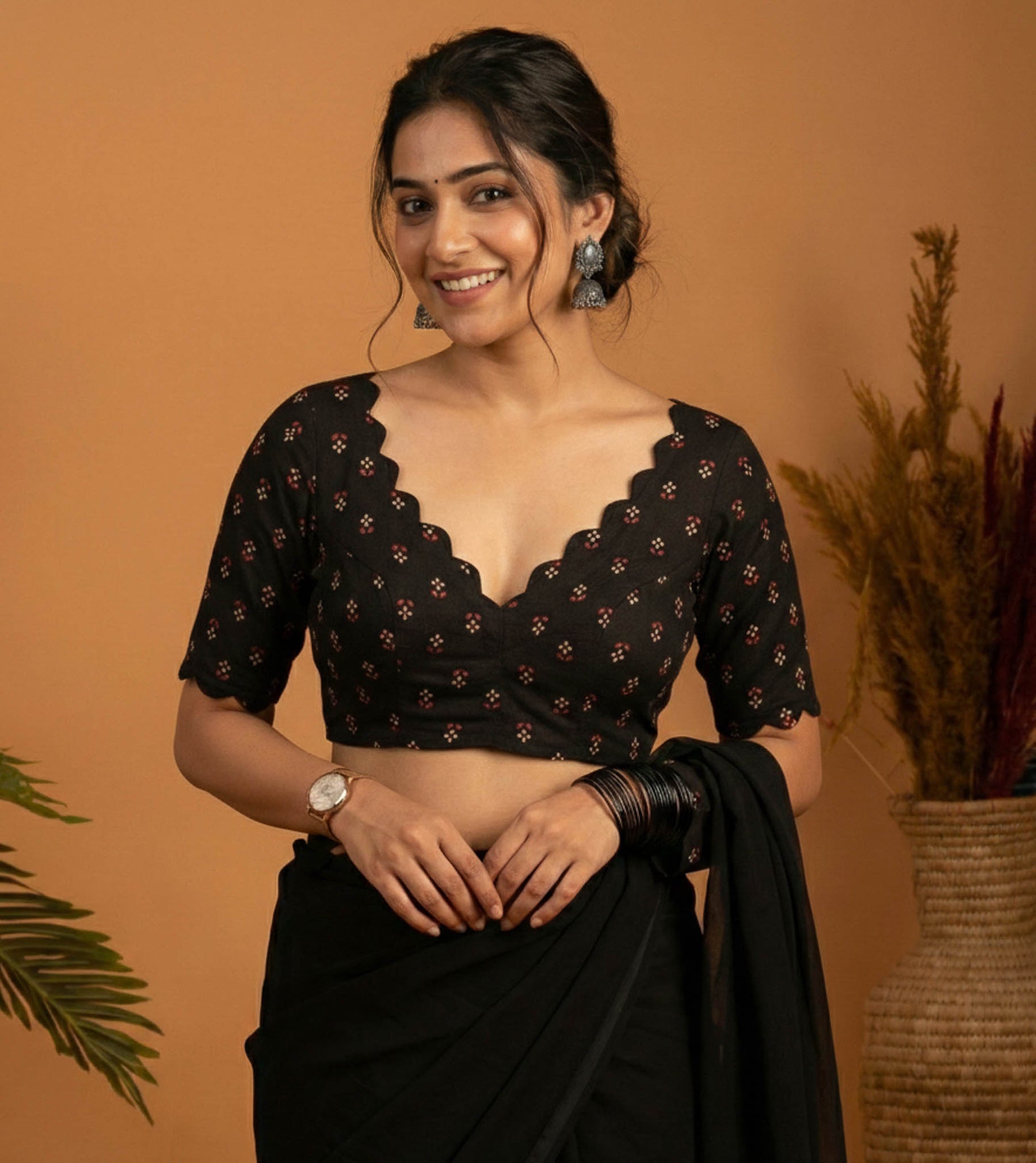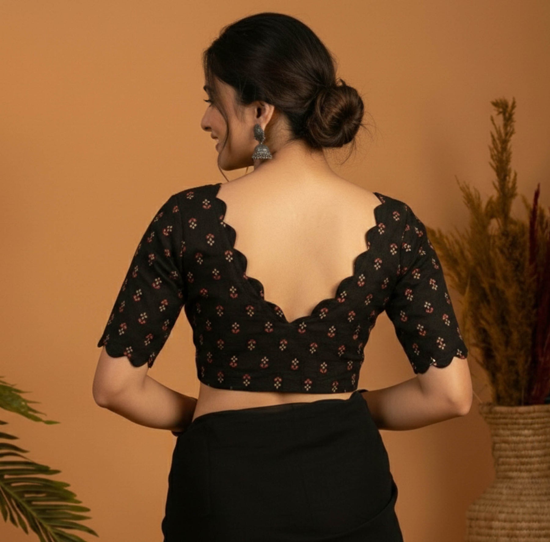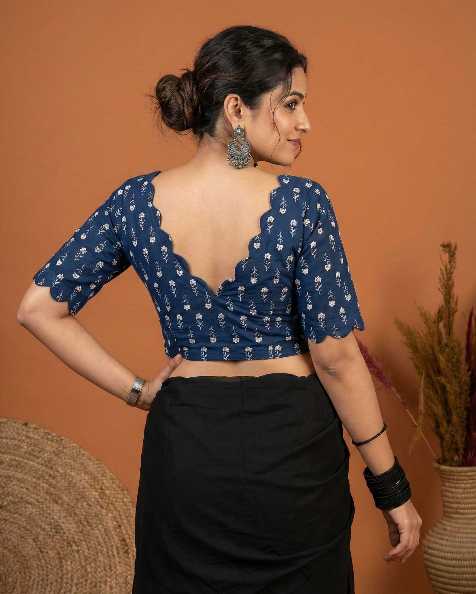 A blend of comfort and charm, this indigo cotton blouse features delicate hand-block prints and a unique scalloped V-neckline - front and back. The half sleeves and structured fit add elegance while keeping it easy to wear all day. Style it with solid sarees for a clean, modern look or pair it with contrast prints for a playful twist. Whether for work or a festive gathering, this blouse effortlessly elevates your drape with subtle statement detailing.