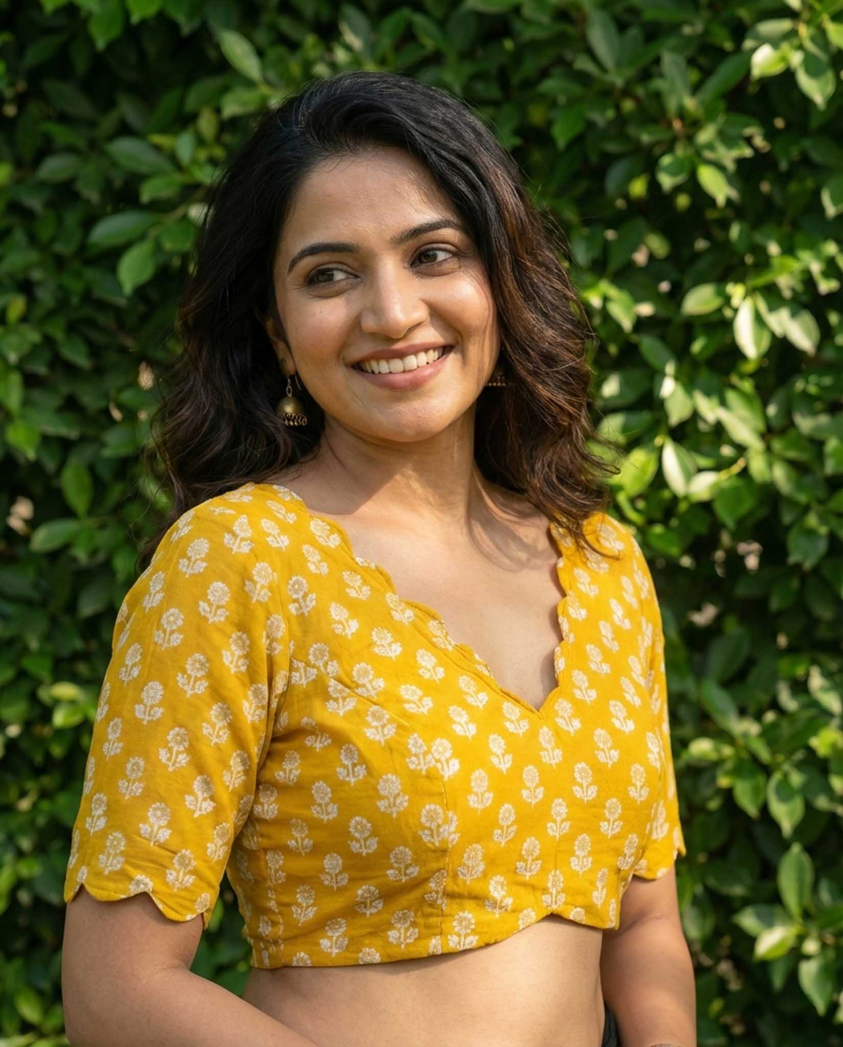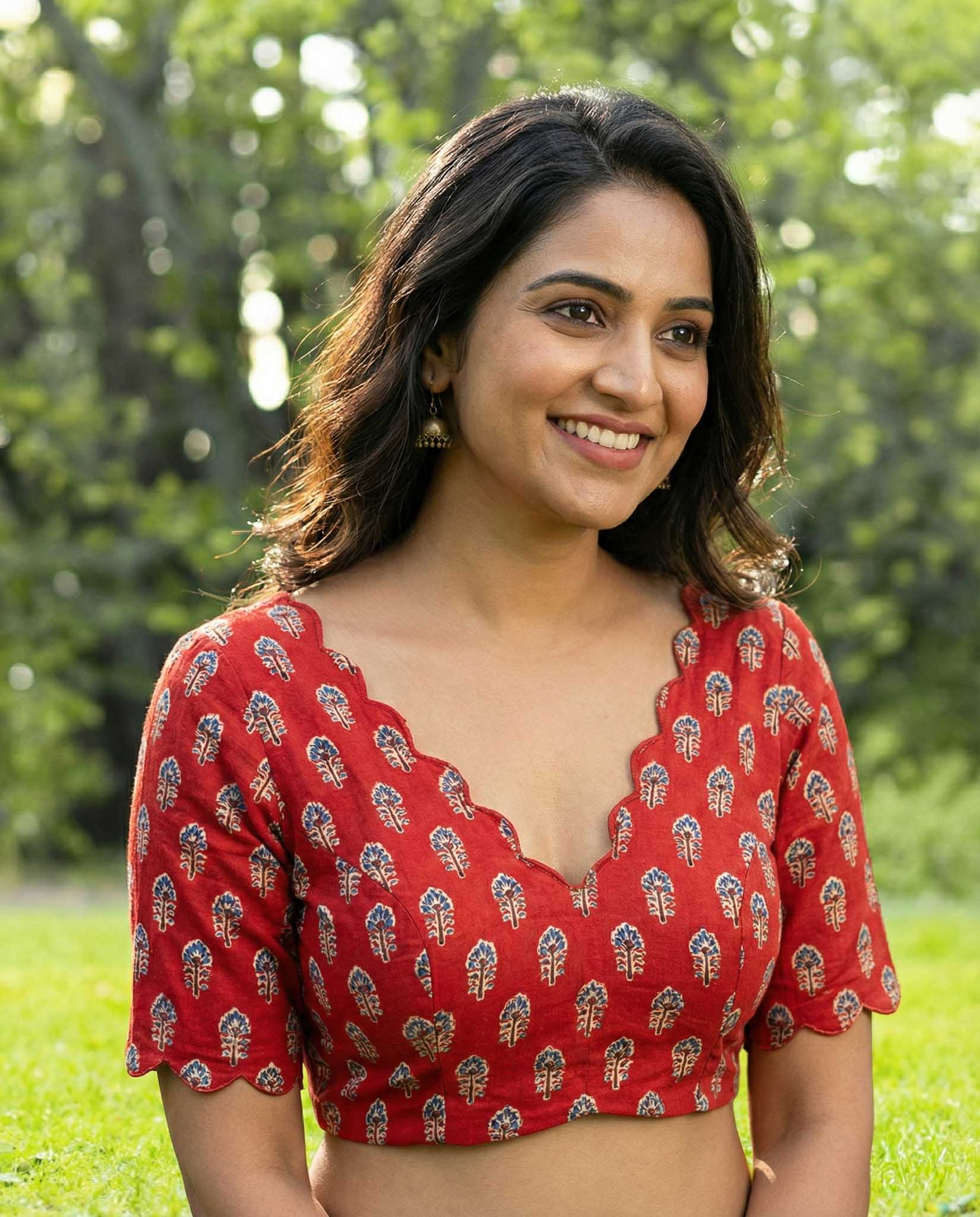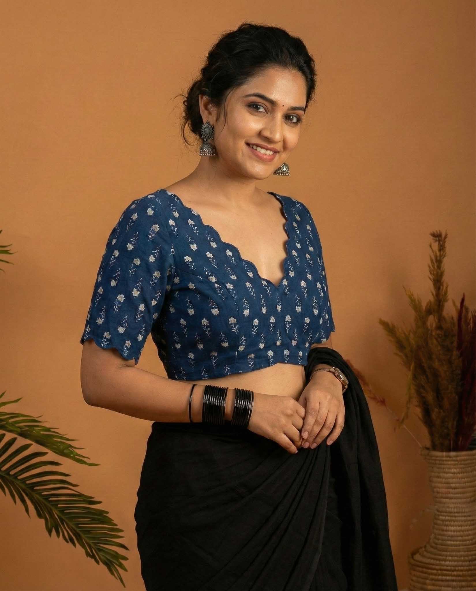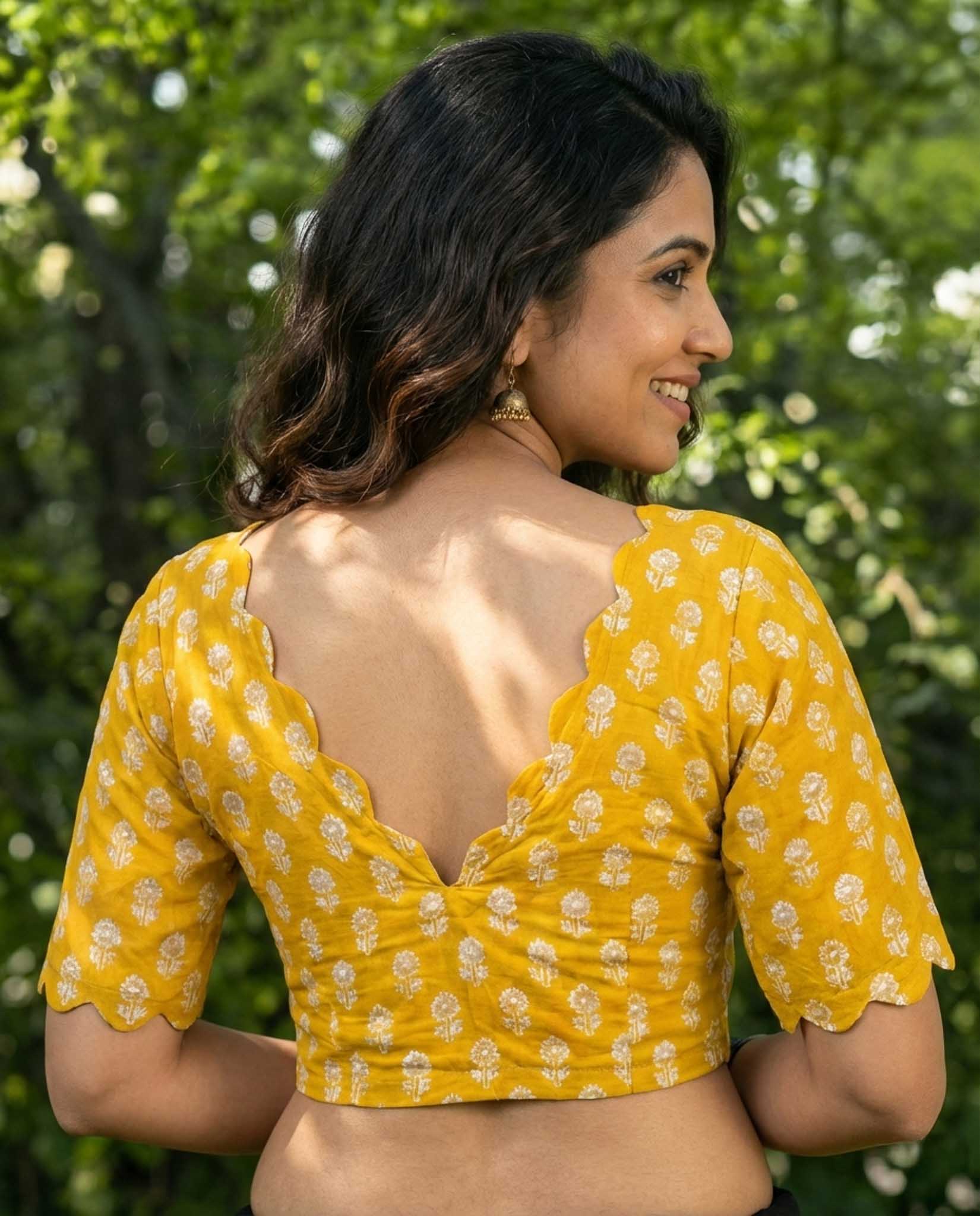 A blend of comfort and charm, this indigo cotton blouse features delicate hand-block prints and a unique scalloped V-neckline - front and back. The half sleeves and structured fit add elegance while keeping it easy to wear all day. Style it with solid sarees for a clean, modern look or pair it with contrast prints for a playful twist. Whether for work or a festive gathering, this blouse effortlessly elevates your drape with subtle statement detailing.