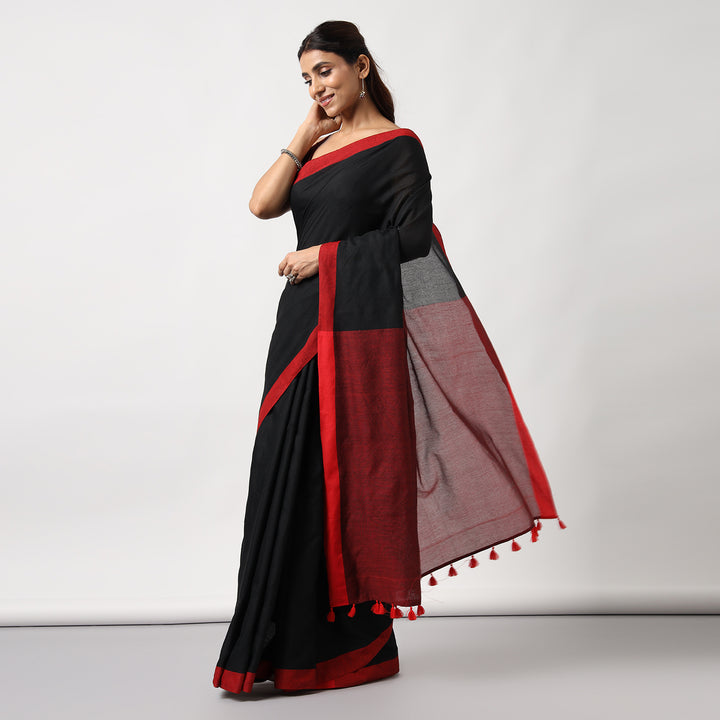 Black Colorblocked Mulmul Cotton Pre-stitched Ready to Wear Saree with Pocket
